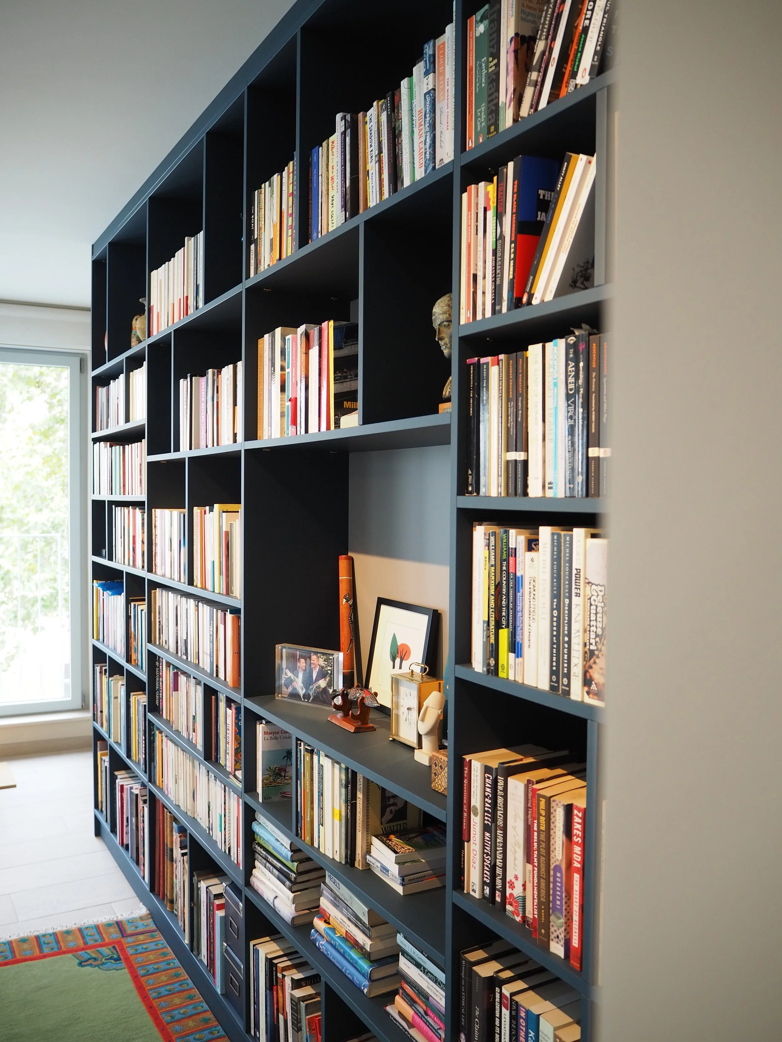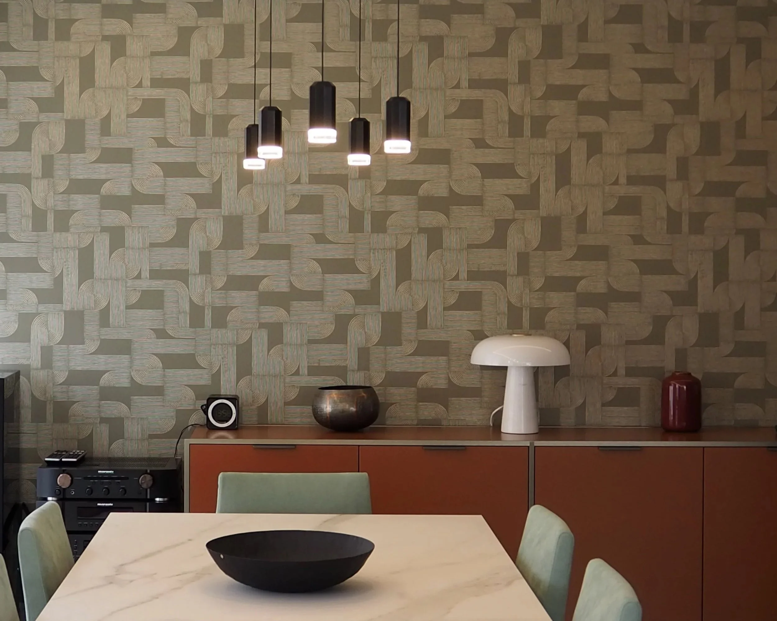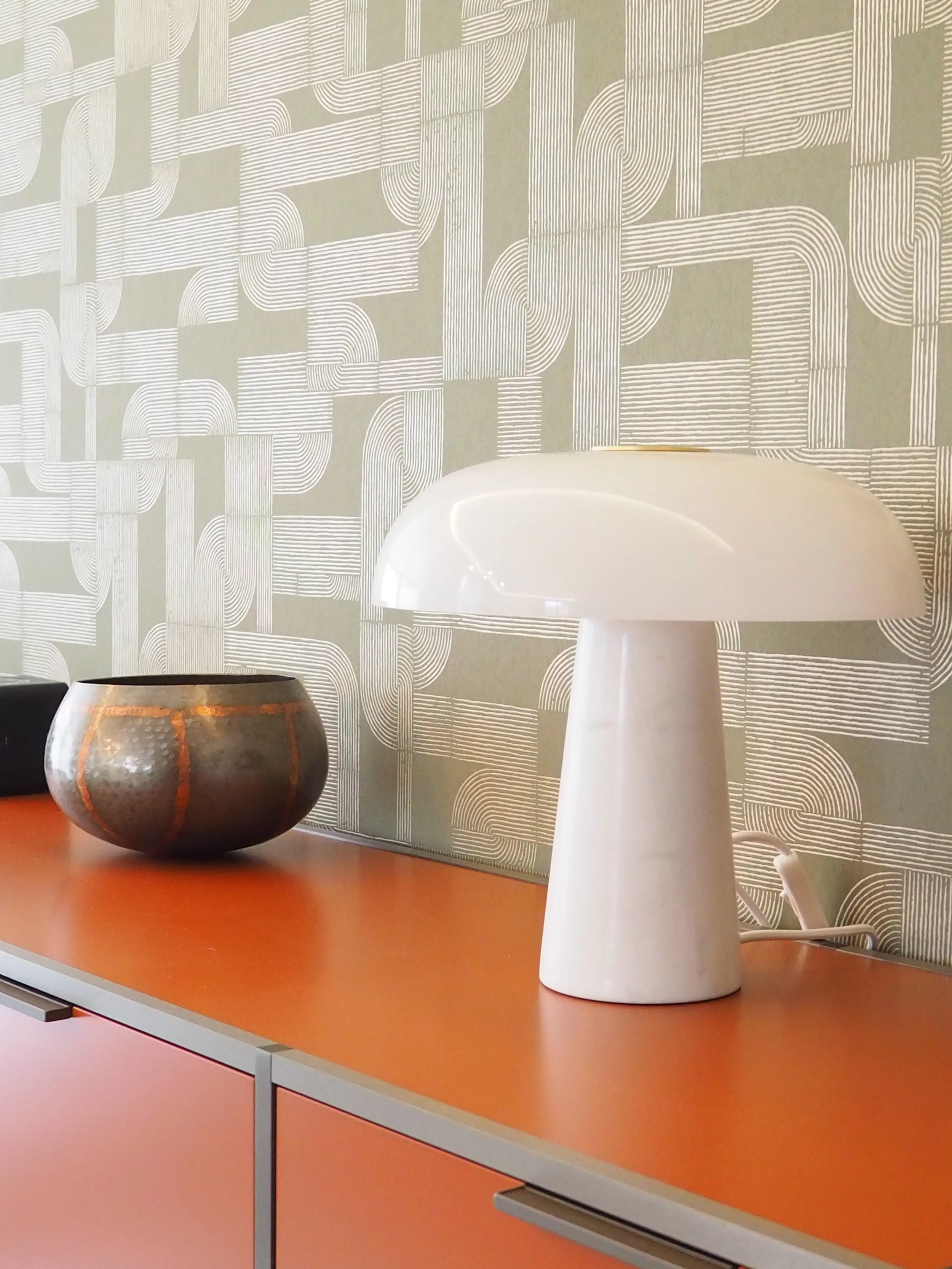 Un accompagnement personnalisé a été fait dans l’ensemble des choix esthétiques et fonctionnels : sélection des matériaux (carrelage, peinture, papier peint), choix du mobilier en intégrant ceux conservés par les propriétaires, des luminaires, des textiles et conception de pièces sur mesure telles que la cuisine, la bibliothèque du bureau et le mobilier de la chambre.